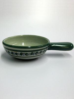 The quintessential bowl for onion soups, this dish is decorated with a green and blue paisley pattern, bordered with a green rim.