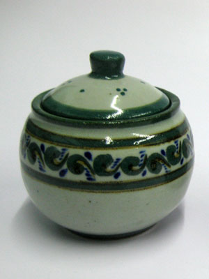 This lovely sugar bowl comes adorned with a green and blue paisley pattern, bordered with a green rim.
